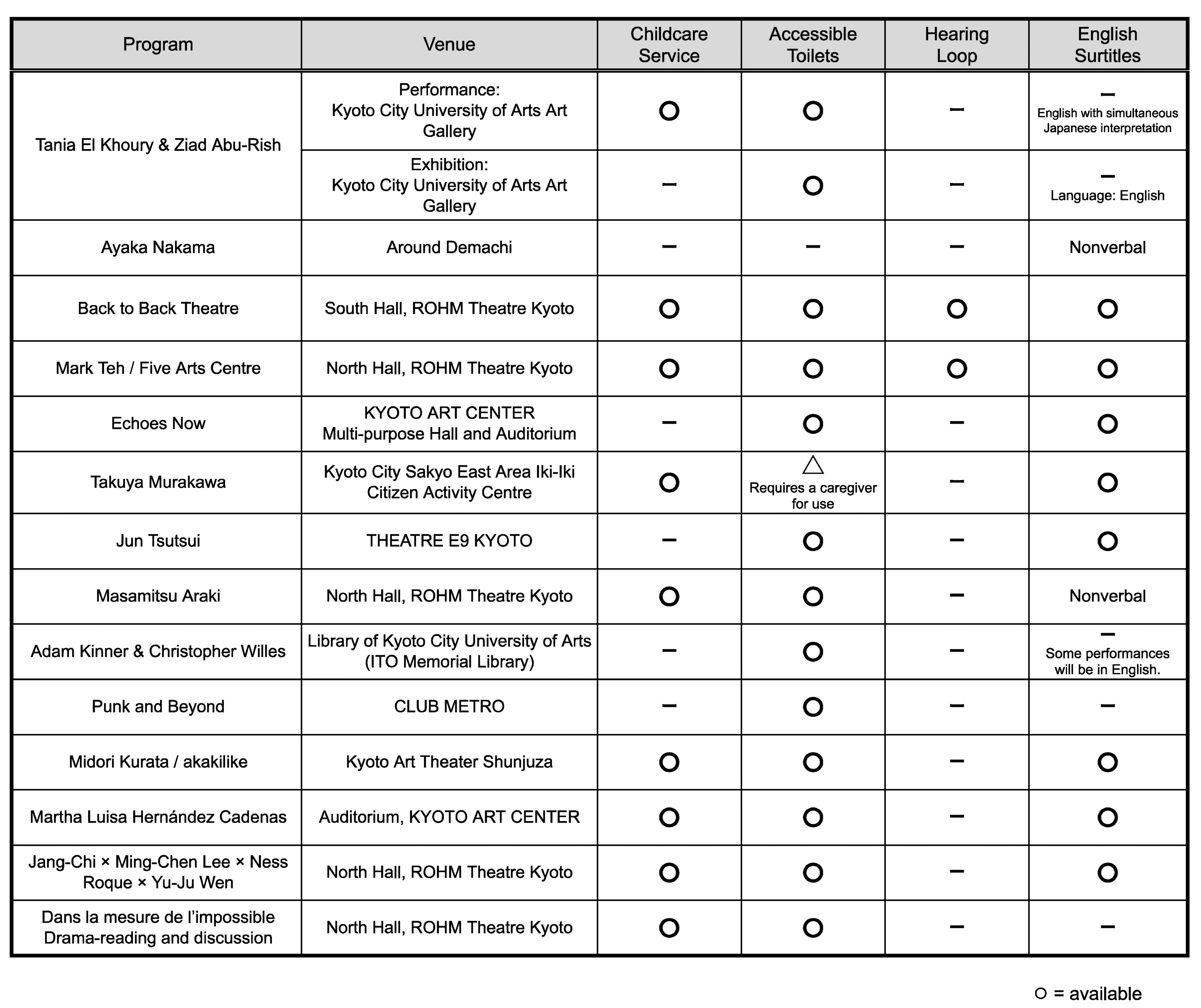 One complimentary ticket is offered to caregivers of those with a disability certificate or caregivers of wheelchair users. Please contact the Kyoto Experiment Ticket Center if you would like to use this service.
