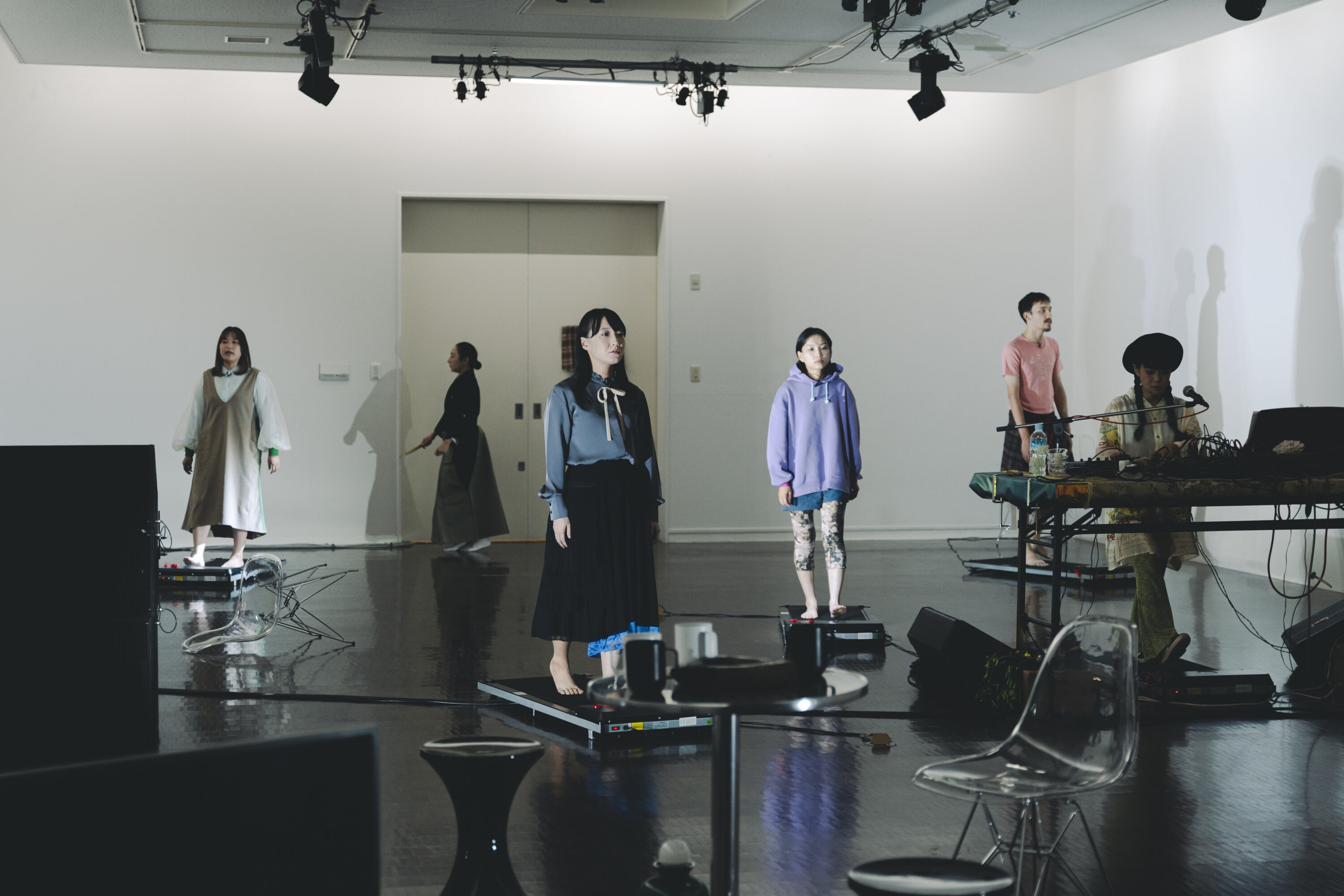 次に、役者たちの中でも異色の存在感を放つ田中とテンテンコについて。芝居全体から見ると、田中は進行役「アイ」に位置づけられる。現代劇とは違う能の所作は、この世界とは別次元の存在を示唆しており、田中のふるまいは芝居世界と現実との橋渡し的なものになっているようだ。また、後半では4人と語り合いその願いを引き出すという「ワキ」(シテの相手役)としての役割も帯び、彼女は二重の役を纏っている。テンテンコは少し趣きが違うアイで、どちらかというと狂言方のような役まわりだろうか。劇中で差し挟まれる皿田との会話シーンはコミカルで笑いを誘うものであったし、明らかに本人としてしゃべっているため、我々観客側=現実世界にも属していることが想像できた。彼女は「あなた(皿田)は生き返ることができる」と伝える超越者のようなふるまいを伴い舞台上に立ち、風の音、ピアノの旋律など多彩な音を生み出しながら最後までそこに居続ける。さらに興味深いのは、物語の終盤で彼女に「時間」を象徴するワキとしての役割が示唆されていることだろう。これをふまえれば彼女にも二重の役割があると言えそうだ。