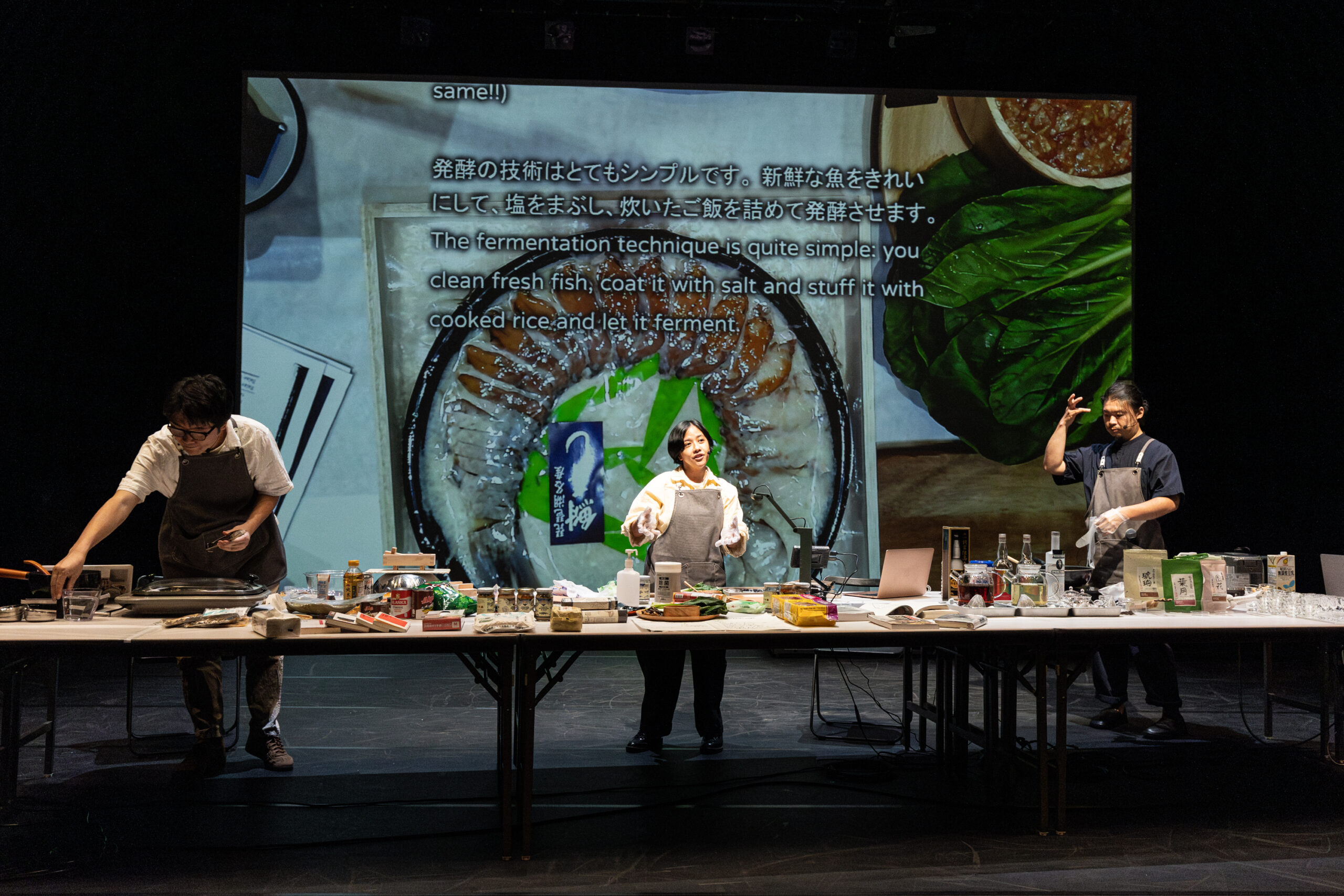 スペイン植民地時代のフィリピンに、やはり植民地だったメキシコからもたらされたカカオから生まれた、チャンポラード(チョコレート粥)。日本統治時代の台湾で日本人技師が品種改良によって生み出し、今も栽培が続く「蓬萊米」(ジャポニカ米)……。こうしたある種の多義性をはらむ「食」を巡って進んできたパフォーマンスは、Jang-Chiによる蓬萊米の酢飯と、チャンポラード、くさやなどを組み合わせた「チャンポラード寿司」作りでクライマックスを迎える。