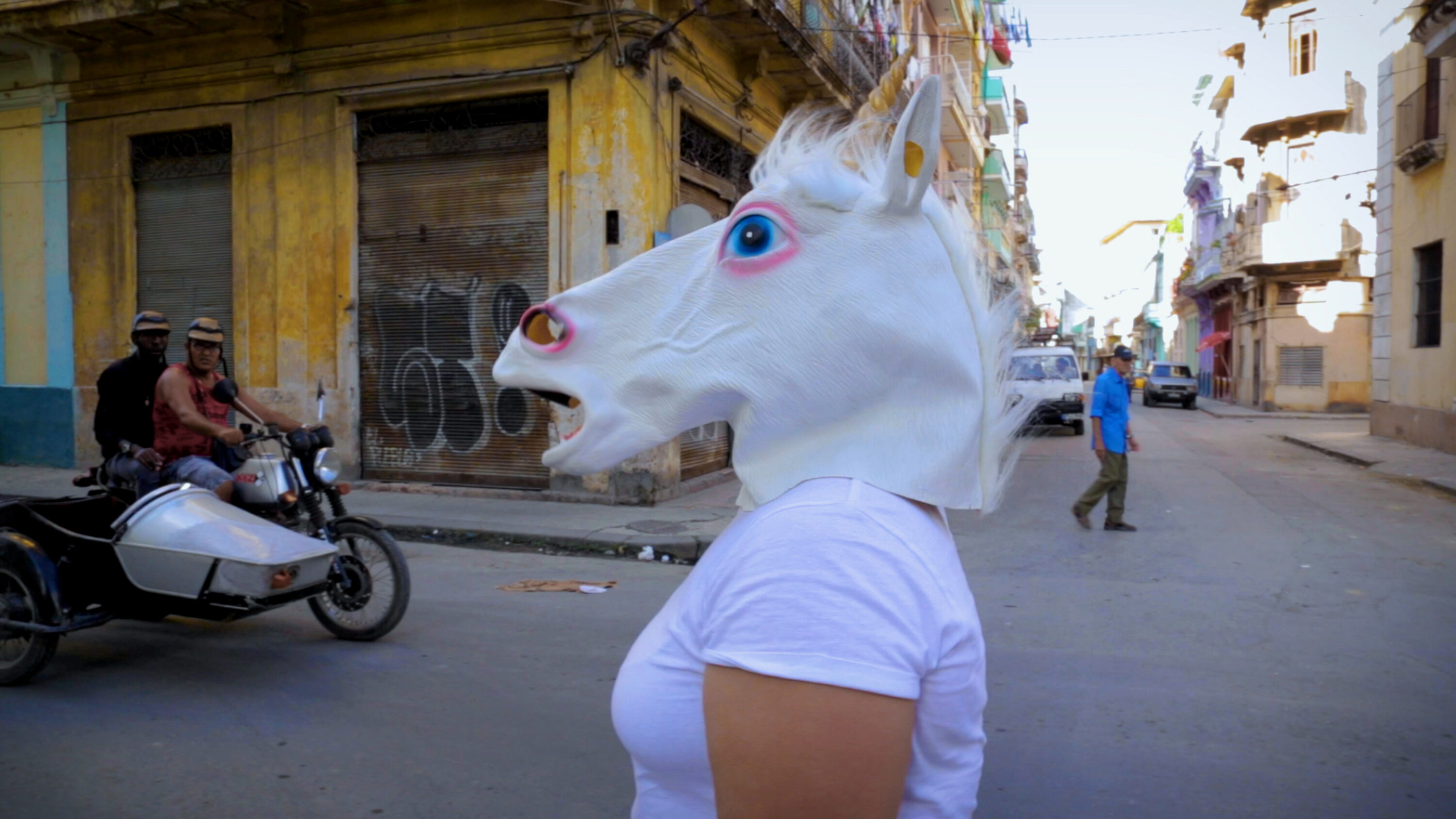 舞台は二重に進行し、一つはマルタの孤独なパフォーマンス、もう一つは映像として映し出されるハバナ建都500年祭の喧騒である。この喧騒の中をユニコーンのマスクを被ったマルタは彷徨う。この映像はマルタと長く協働している映像作家ジョアンナ・モンテロによるものだ。