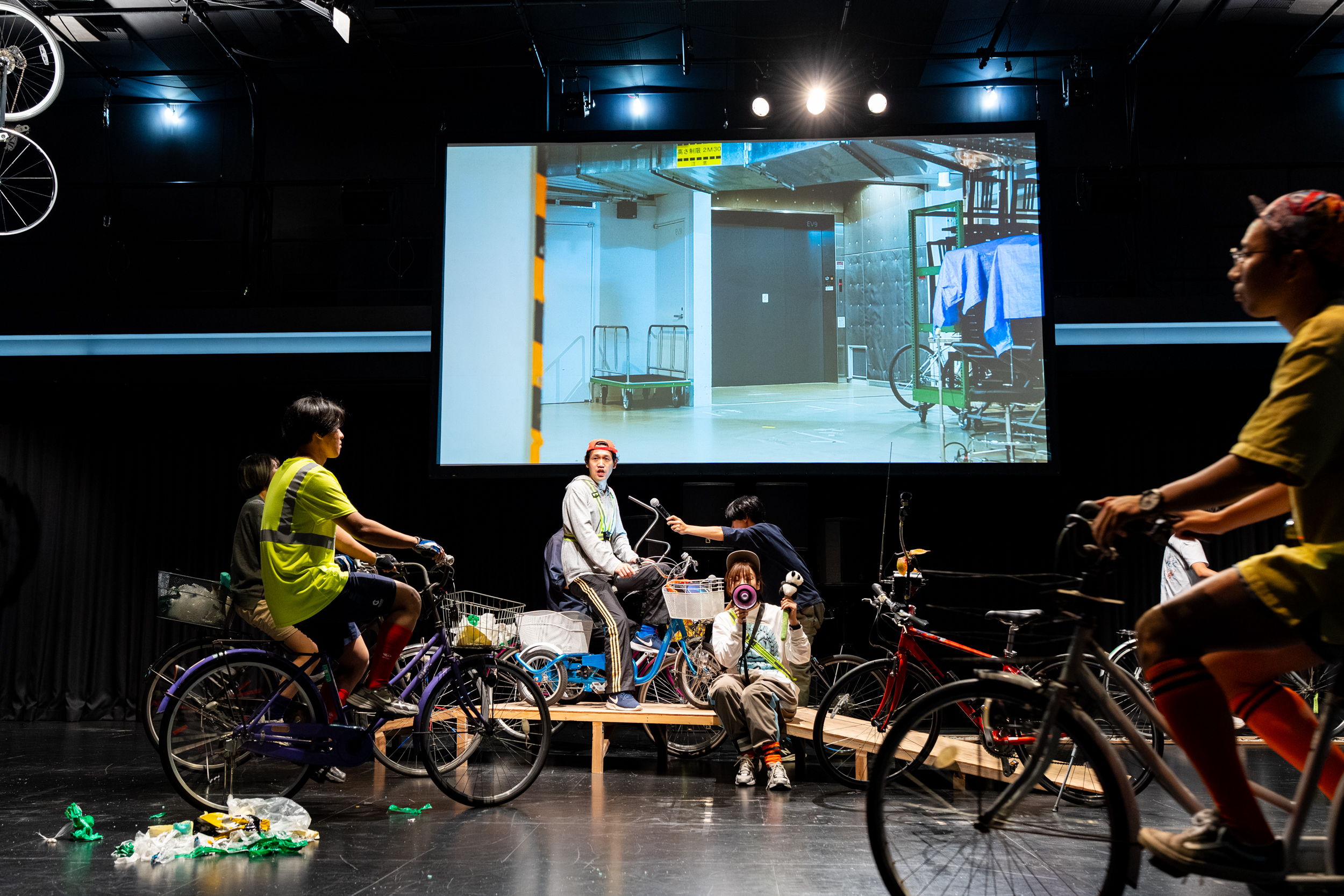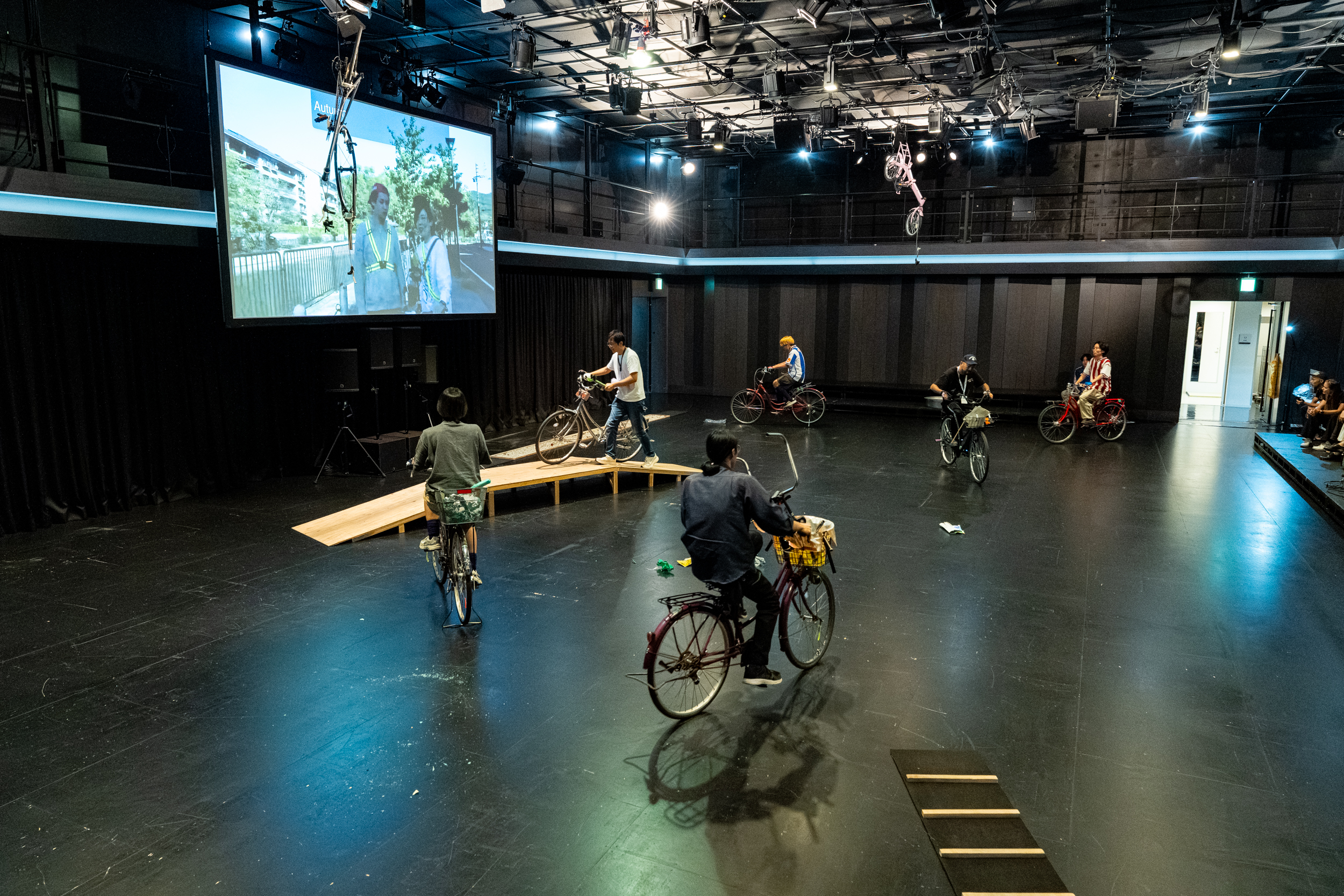 地下にあるノースホールへの階段を降りると、すでに始まっていた。ホワイエ/エントランスしか開場されておらず、劇場空間を取り巻く通路を自転車に乗った演者たちがあれこれ喋ったりしながら練り歩いていた。その誰かについていったり、別の誰かを気にしてたりするうちに中に入れるようになり、これは『空き地のTT』の時も同じだったか、舞台を取り払っただだっぴろいだけの体育館めいた空間の一辺に横並びに私たちは座った。席はない。座布団だけ。私はこの時、右膝を痛めていたので座るのがしんどかった。大きなスクリーンにさっきまで通路にいたはずのパフォーマーがロームシアター京都の外を喋りながら歩いているのが映っている。同時中継は上手くいかない回もあったらしいが私の時はおおむね順調だった。観客=聴衆の対面に大きなスピーカーがある。オンボロ自転車にトラメガを載せた荒木優光が場内に緩々と入って来る。自転車軍団も入って来る。みんな思い思いに自転車を乗り回しているが、たぶんスポークに仕掛けがしてあり、車輪が回ると音が出る。その音が増幅されてスピーカーから出る。外にいた連中も帰ってくる。自転車で場内外を走り回ったり、