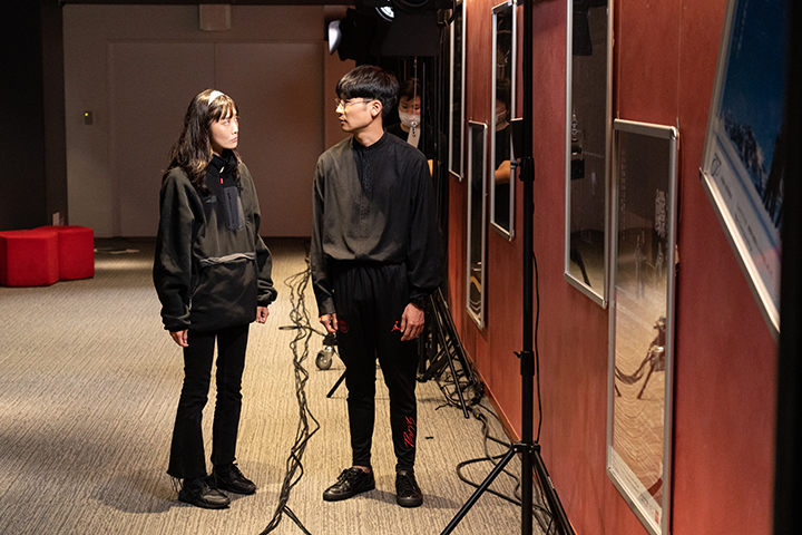 ここに来るまで想像していたのは、例えば舞台上にパフォーマンスをする人とそれを撮影するカメラマンがいて、撮影された映像が「もう一つの(複製された)現実」として今ここの現実の上にリアルタイムで重ね描きされていくといった趣向のものだった。二年ぐらい前に同じロームシアター京都のノースホールで見たスペースノットブランクの作品でも映像がそういう演出効果として用いられていた記憶がある。今回は「映画」ということで、それがいくらかスケールアップし、物事がより複雑な状況へと向かっていくようなことを覚悟していたのだが、実際訪れてみると、何が始まるのかはよくわからないが、とにかくデカいスクリーンがあるというとてもシンプルな状況が待ち受けていたので、少しホッとした。