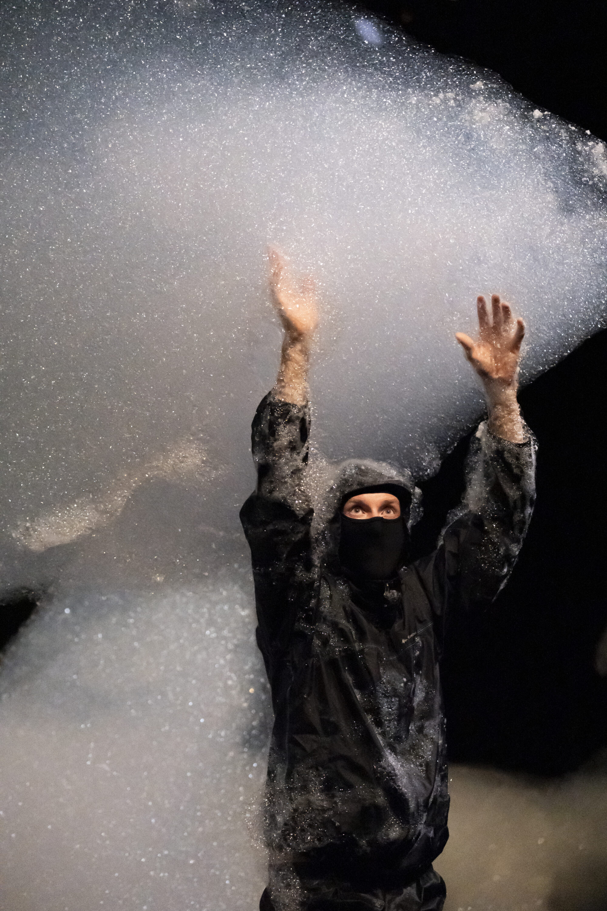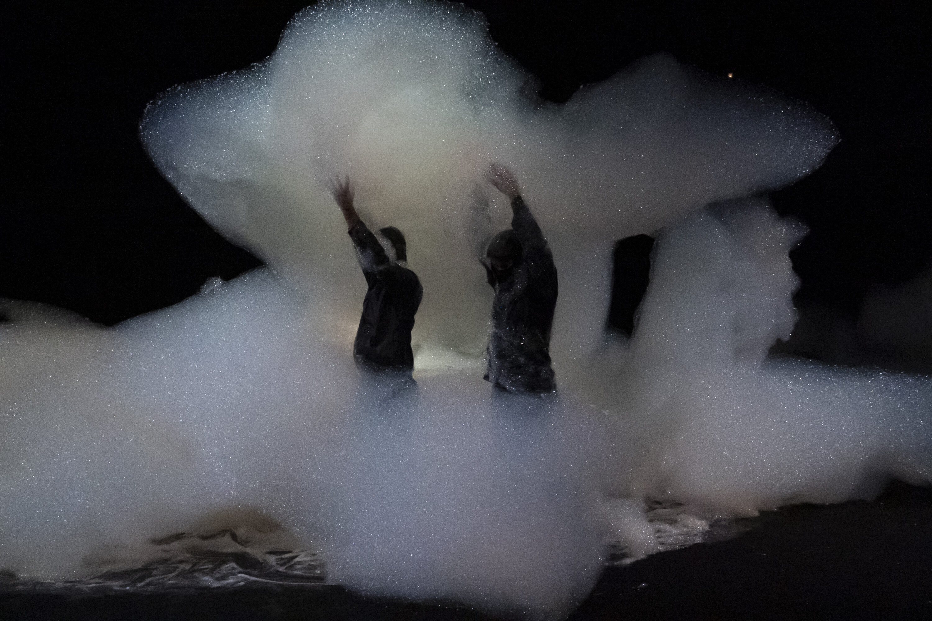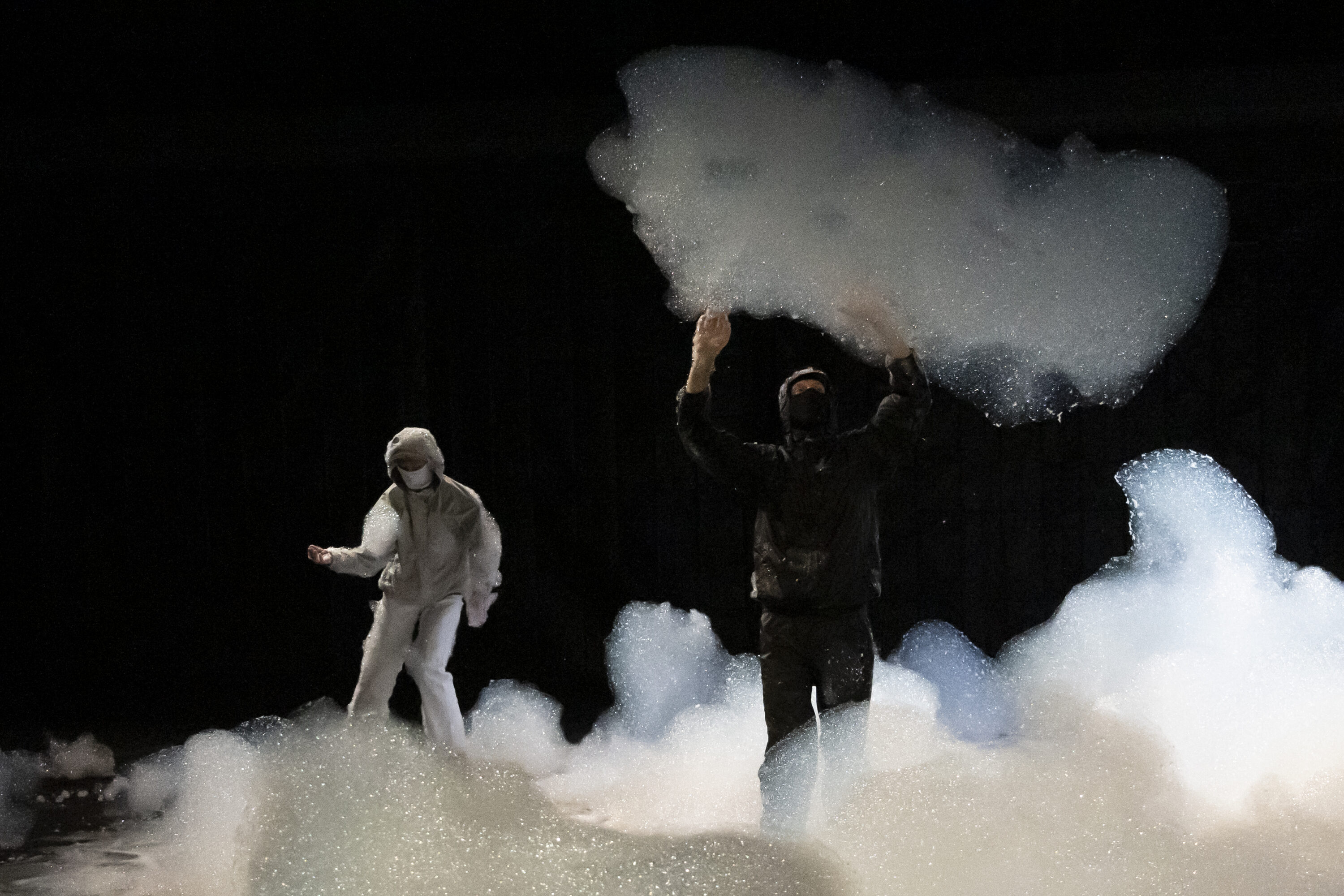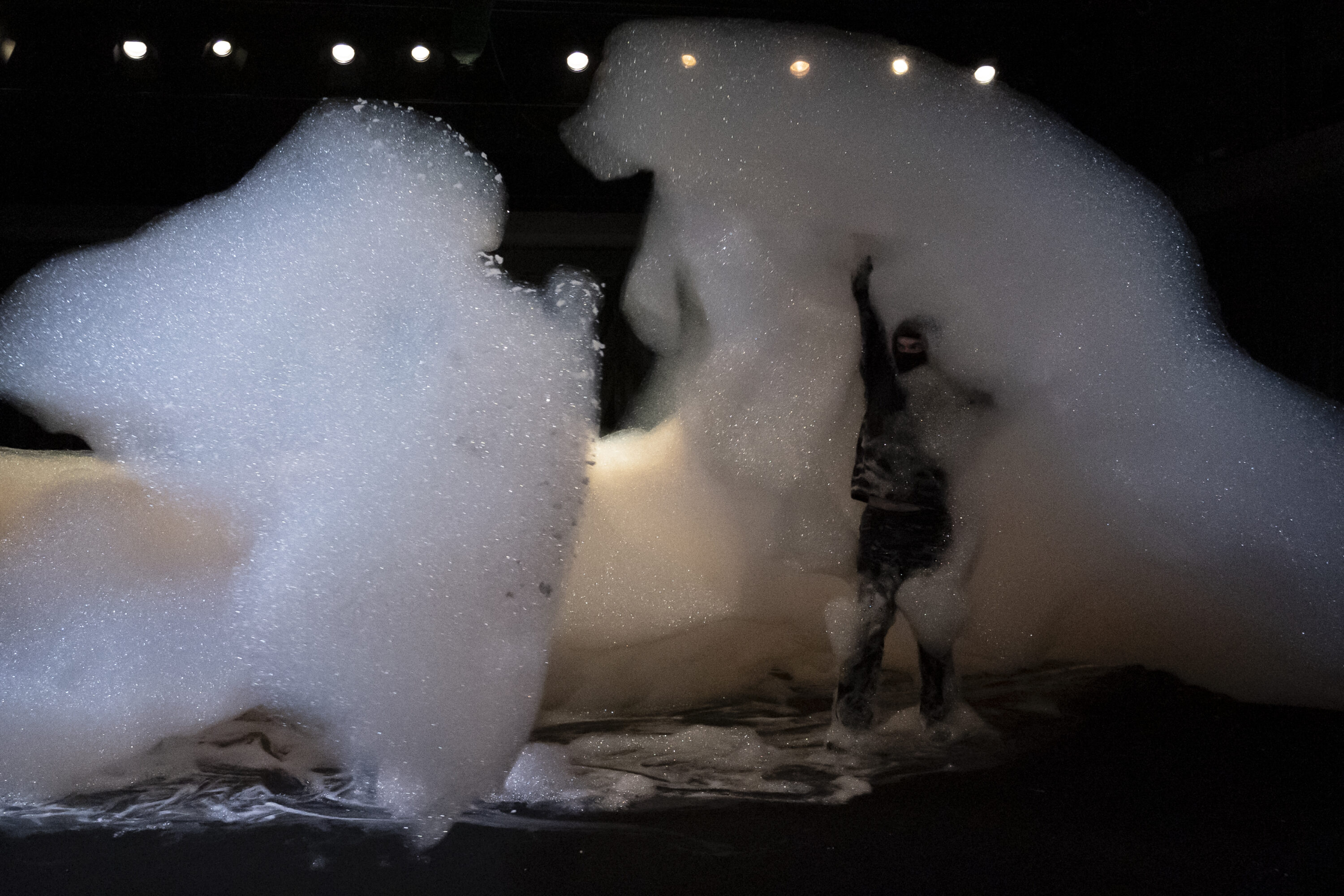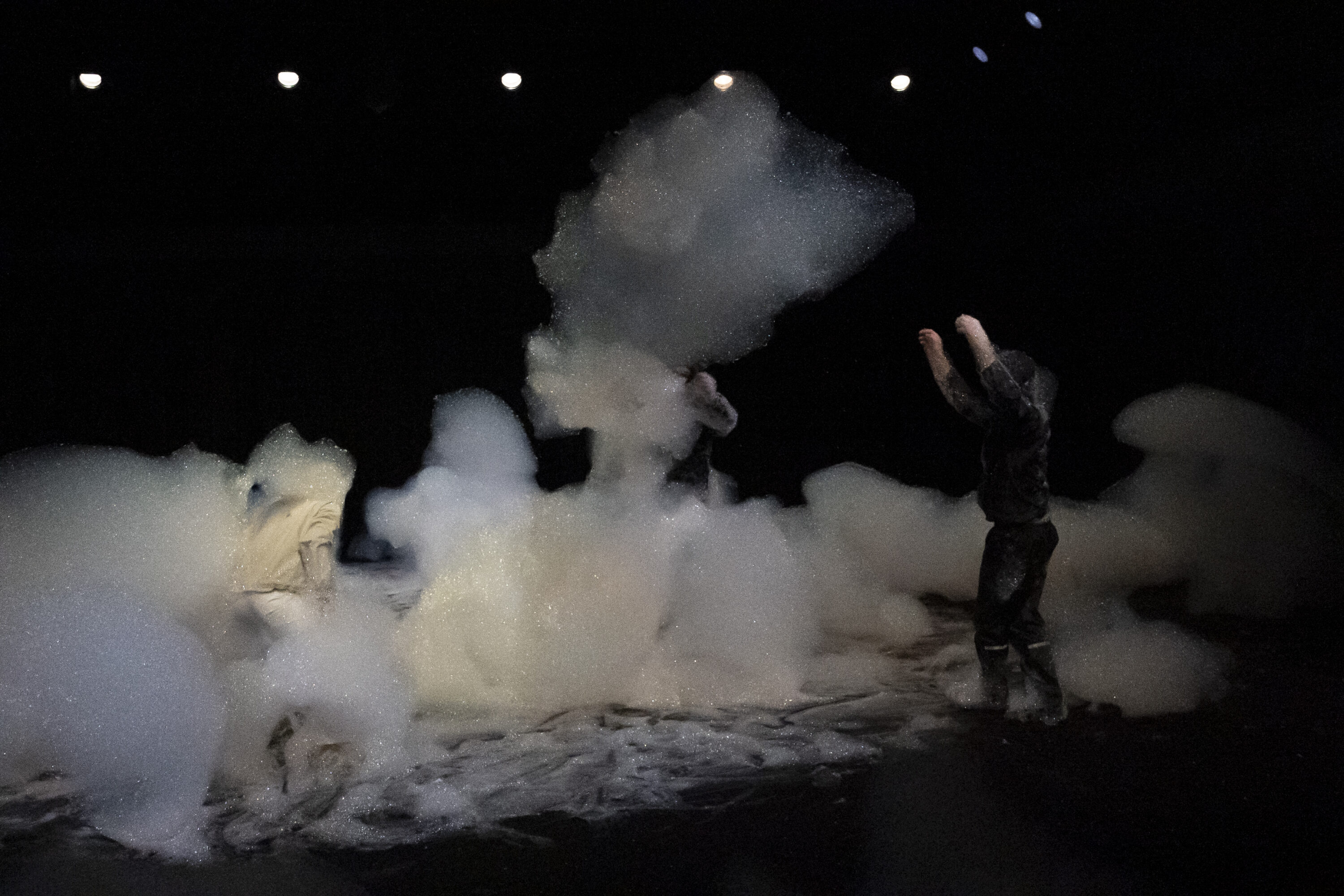 降り積もり、舞台上の空間を支配しているのは、巨大な泡の塊だ。ダンサーたちは、視覚的な量に対して驚くほど軽いこの素材と、慎重にコンタクトしていく。最初は泡にうずもれ溺れているように、めくりあげ抱くように、そしてちぎってまとうように。泡に動きが導かれ、ダンサーが泡を彫刻する。しかし、どれだけ注意深く触れても、泡は弾けてしまう。やがて、わずかな痕跡と身体だけが残される。