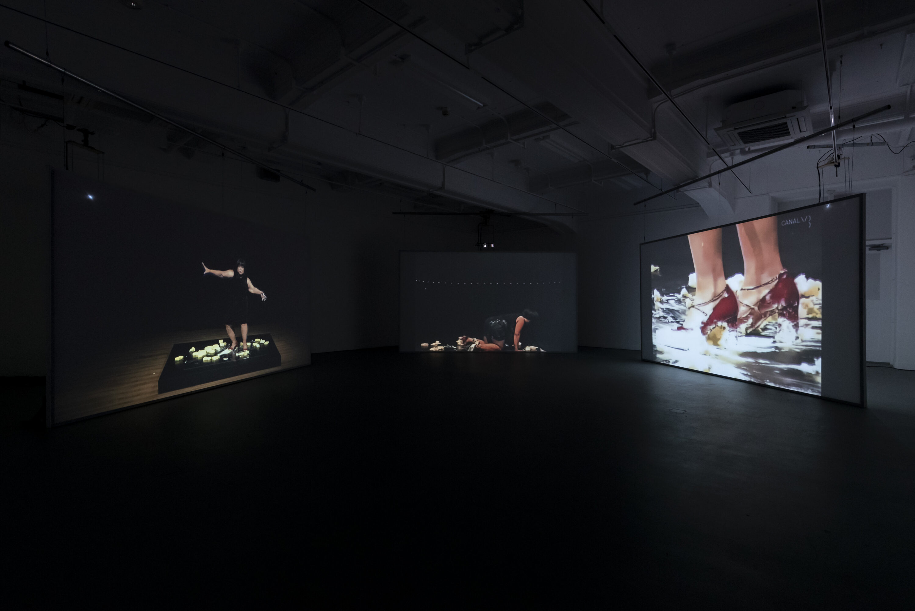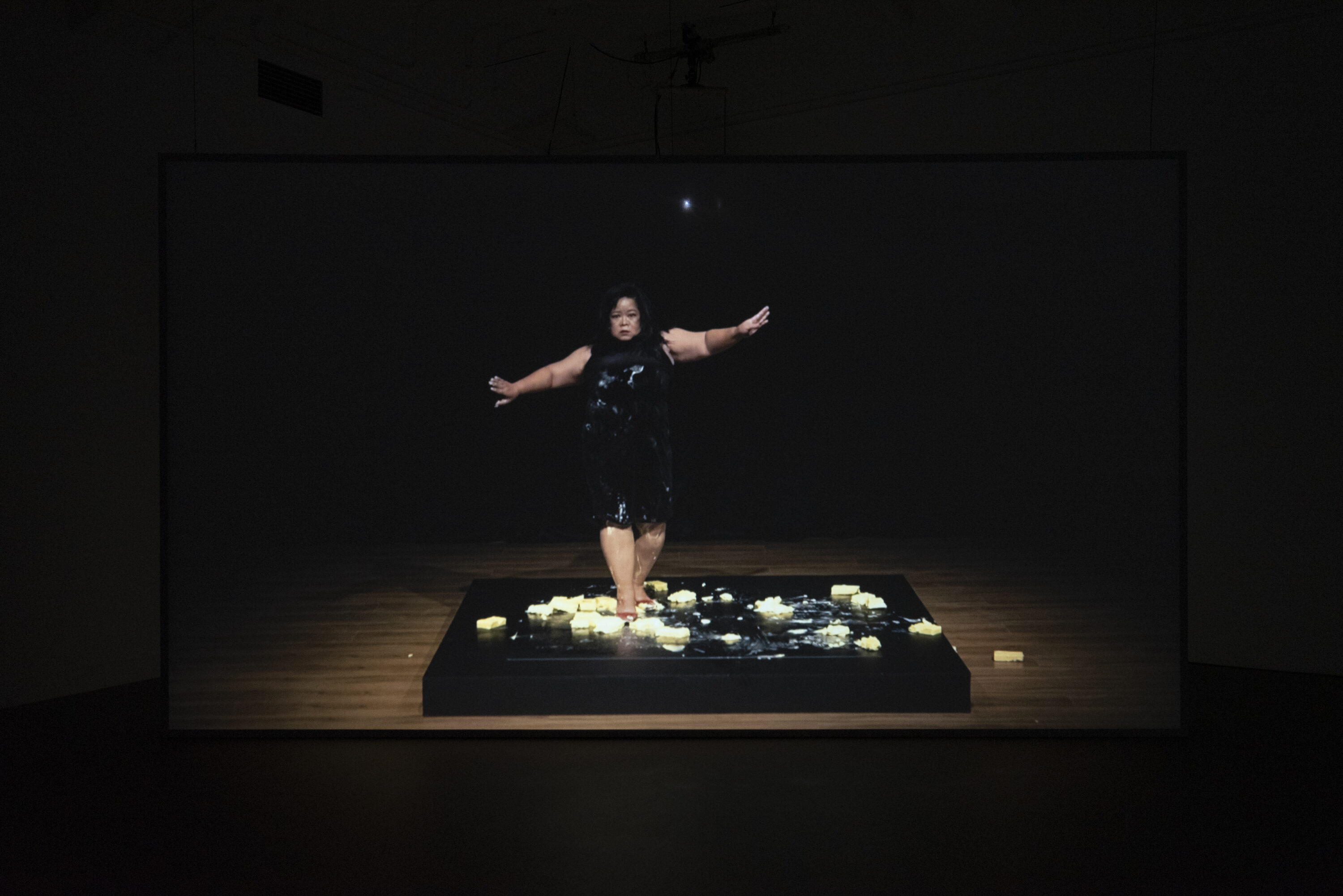 インドネシア語で“It doesn’t matter. It’s OK. Don’t worry.” という意味がつく展示「TIDAK APA-APA」では、2つの映像作品を紹介。タイトなワンピースとハイヒールという出で立ちのスルヨダルモがお立ち台のように設えられたバターの塊の上で踊る代表作『Exergie – butter dance』は、2000年の発表以降、さまざまな場所で上演されてきた。溶けていくバターに足をとられ、ダンスは中断と再開を繰り返す。今回の展示では、時期の異なるパフォーマンスの記録映像がひとつのインスタレーションとして構成される。