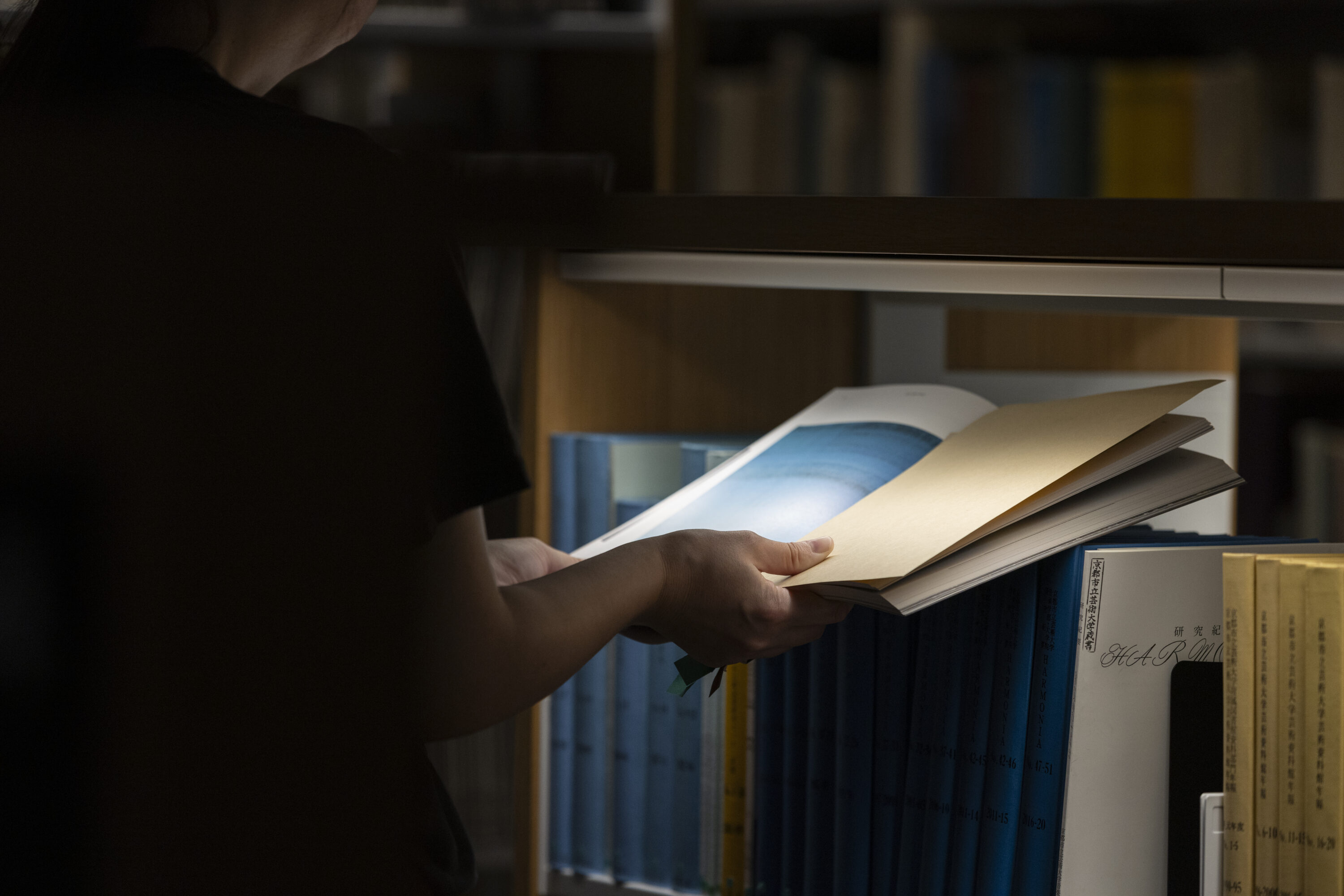指定された場所で待ち合わせた観客とパフォーマー(案内人)は、館内をそっと探検しながら、共に本を眺めたり、読んだり、イヤフォンから流れる音に耳を澄ませていく。深く集中するほどに鋭敏になる五感、高まる没入感。施設の日常と交錯しながら秘密裏に、スリリングに進む一連の体験は、「感覚をひらく場」としての図書館を自分自身の手で再発見していく試みなのかもしれない。