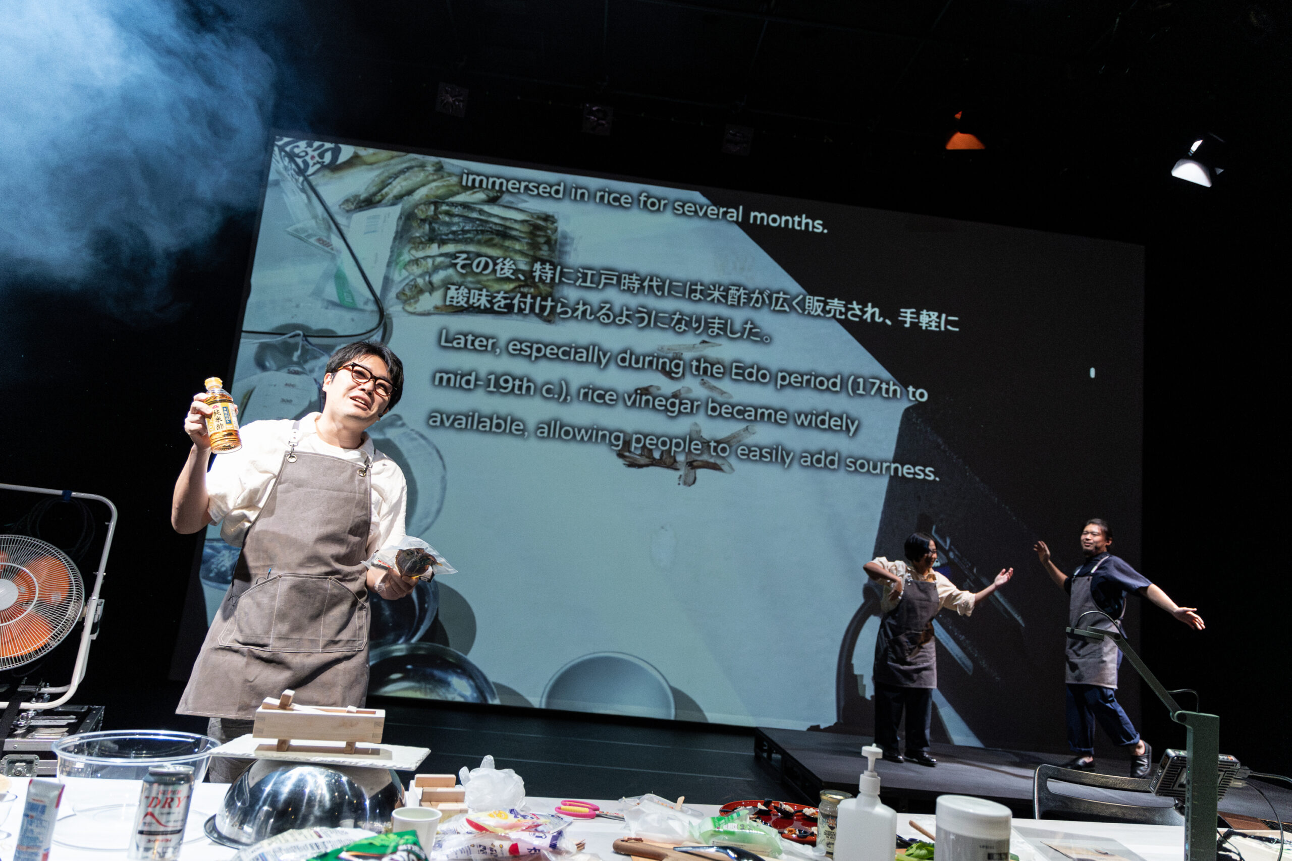 メンバーはアーティスト・コレクティブ「オル太」メンバーのJang-Chi、台北拠点でパフォーマンスとビジュアル・アートを横断した活動を行う李銘宸、フィリピン出身の俳優・ドラマトゥルクのネス・ロケ、台湾生まれで日本語で小説を執筆する温又柔。それぞれの母語とそうでない言語が飛び交う舞台では、さまざまなトピックが旅していく。話題は太古の島々の発酵食から、互いの言語や翻訳にまつわるエピソード、大切な味の記憶まで。やがてキッチンでもある舞台で、できあがるものとは。